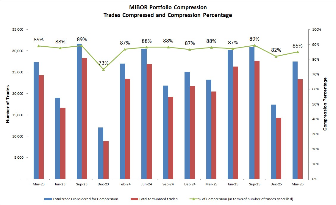 On 5th March 2026, CCIL successfully carried out the 41st cycle of the Portfolio Compression exercise in the Interest Rate Swaps market for MIBOR Benchmark, aimed at reducing the overall notional outstandings and the number of outstanding contracts by identifying economically redundant trades for early termination. 31 large foreign, private and nationalized sector Banks and Primary Dealers participated in this exercise. Of the 27,479 trades between 31 members which were found to be eligible for being considered for compression, 23,013 trades were identified for early termination achieving a compression rate of 84.92%. 23,013 trades were terminated fully while 322 trades were partially terminated. The reduction in market-wide Notional Outstanding of Rs. 965,264.86 Crores was achieved through this portfolio compression exercise. The compression exercise included both trades cleared by CCIL and non-cleared trades.